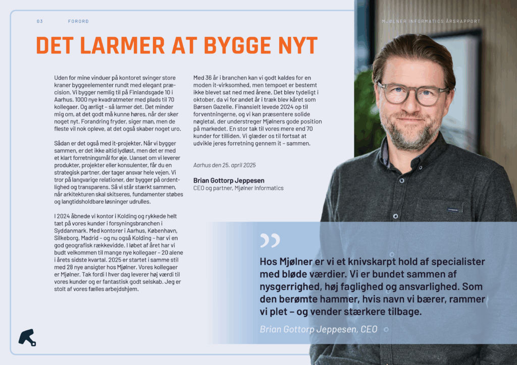 I spent a week creating the graphics for Mjølner Informatics’ annual report. I did my best to create a professional, yet dynamic, look, while respecting the design manual.