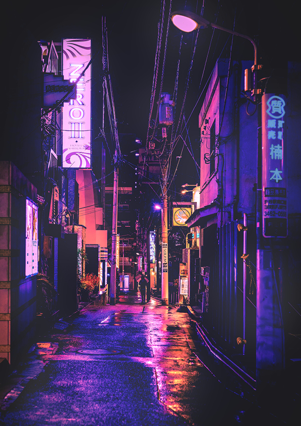 To infuse a back alley photo with the style of Cyberpunk I edited the colours to include more purple and orange light. I also edited the signs to include neon lights.